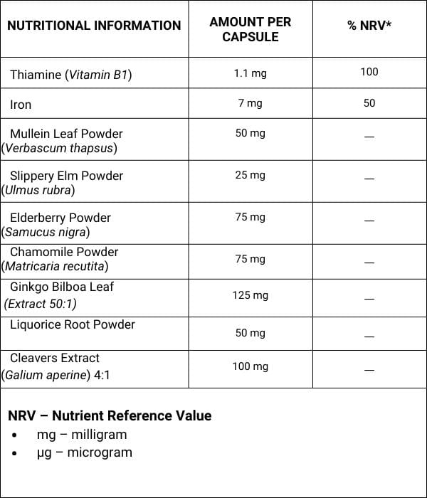 Liquorice Root Powder – Mullein Leaf Powder (Verbascum thapsus), Slippery Elm Powder (Ulmus rubra), Ferrous (Iron) Fumarate, Vitamin B1 (Thiamine HCI).