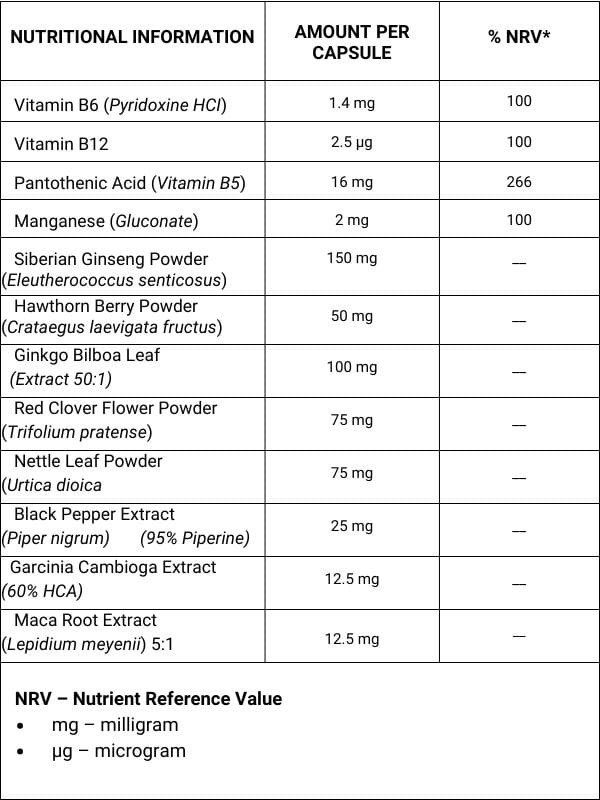 Siberian Ginseng Powder (Eleutherococcus senticosus), Ginkgo Bilboa Leaf Extract 50:1, Capsule Shell: HPMC (Hydroxypropyl Methyl Cellulose) vegetarian capsules, Red Clover Flower Powder (Trifolium pratense), Nettle Leaf Powder (Urtica dioica), Hawthorn Berry Powder (Crataegus laevigata fructus), Black Pepper Extract (Piper nigrum) (95% Piperine), Vitamin B5 (Calcium D-Pantothenate), Manganese Gluconate, Garcinia Cambioga Extract (60% HCA), Maca Root Extract (Lepidium meyenii) 5:1 (Maltodextrin), Vitamin B6 (Pyridoxine HCI), Vitamin B12 (Methylcobalamin, Dicalcium Phosphate).