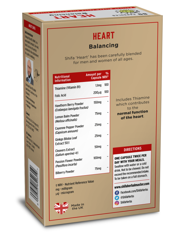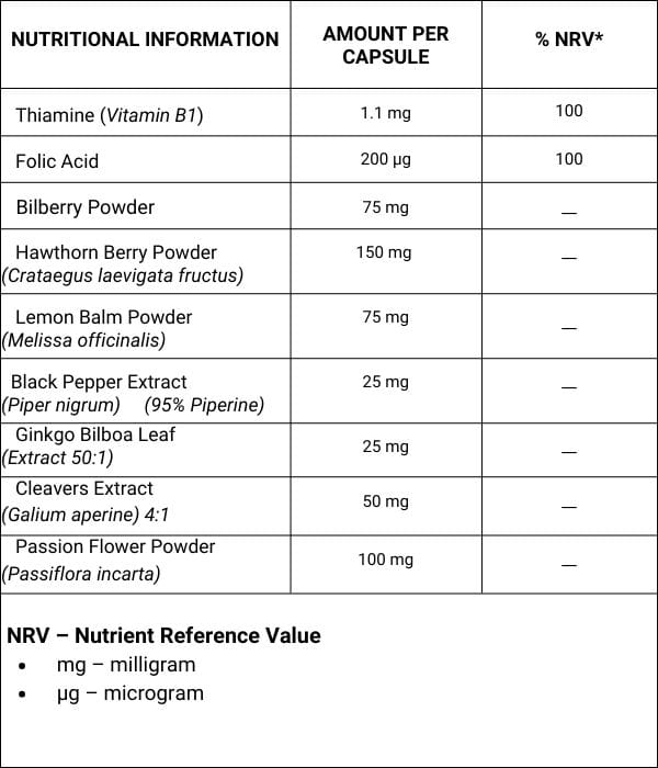 Hawthorn Berry Powder (Crataegus laevigata fructus), Passion Flower Powder (Passiflora incarta), Capsule Shell: HPMC (Hydroxypropyl Methyl Cellulose) vegetarian capsules, Lemon Balm Powder (Melissa officinalis), Bilberry Powder, Cleavers Extract (Galium aperine4:1, Black Pepper Extract (Piper nigrum) (95% Piperine), Ginkgo Bilboa Leaf Extract 50:1, Vitamin B1 (Thiamine HCI), Folic Acid (5-Methyltetrahydrofolate).