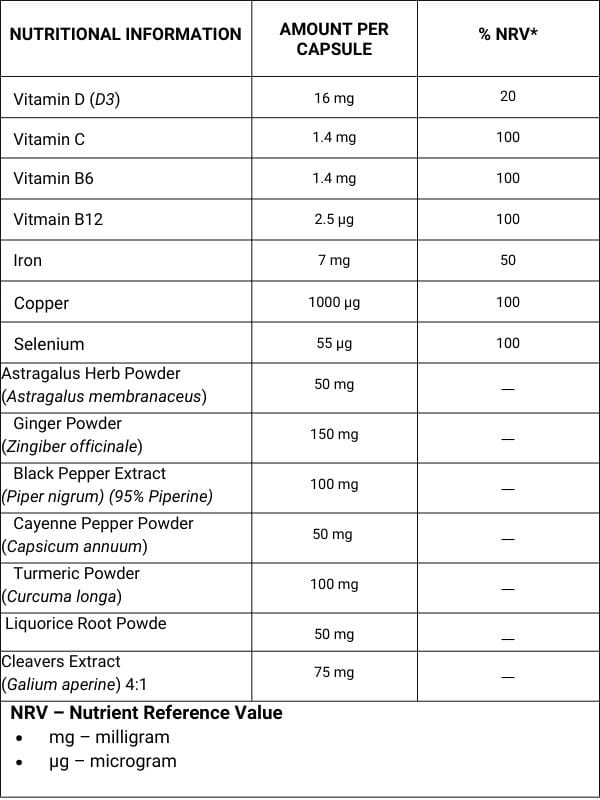 Liquorice Root Powder – Black Pepper Extract (Piper nigrum), Cayenne Pepper Powder (Capsicum annuum), Ferrous (Iron) Fumarate, Vitamin C (Ascorbic Acid), L-Selenomethionine (Selenium) (Di Calcium Phosphate), Copper Gluconate, Vitamin D3 (Cholecalciferol), (Acacia Gum, Sucrose, Sunflower Oil, Starch, D3 Oil), Vitamin B6 (Pyridoxine HCI), Vitamin B12 (Methylcobalamin, Dicalcium Phosphate).